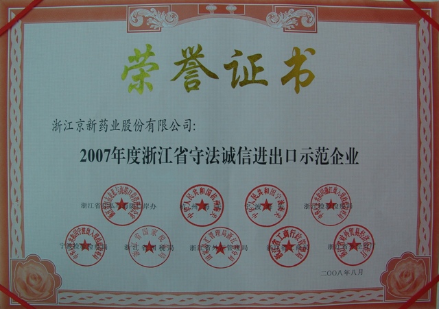 为树立遵法诚信收支口企业典范,,,,,,,,推进收支口企业诚信系统建设,,,,,,,,浙江省打私与海防口岸办、杭州海关、宁波海关、浙江磨练检疫局、宁波磨练检疫局、省国税局、省外汇管理局、省工商局、省外经贸厅团结在全省规模内开展了2007年度遵法诚信收支口树模企业推荐运动。。。。。。。。经各市打私办与有关职能部分派合推荐,,,,,,,,省级有关部分派合审核,,,,,,,,宣布了2007年度浙江省遵法诚信收支口树模企业,,,,,,,,我公司榜上著名。。。。。。。。