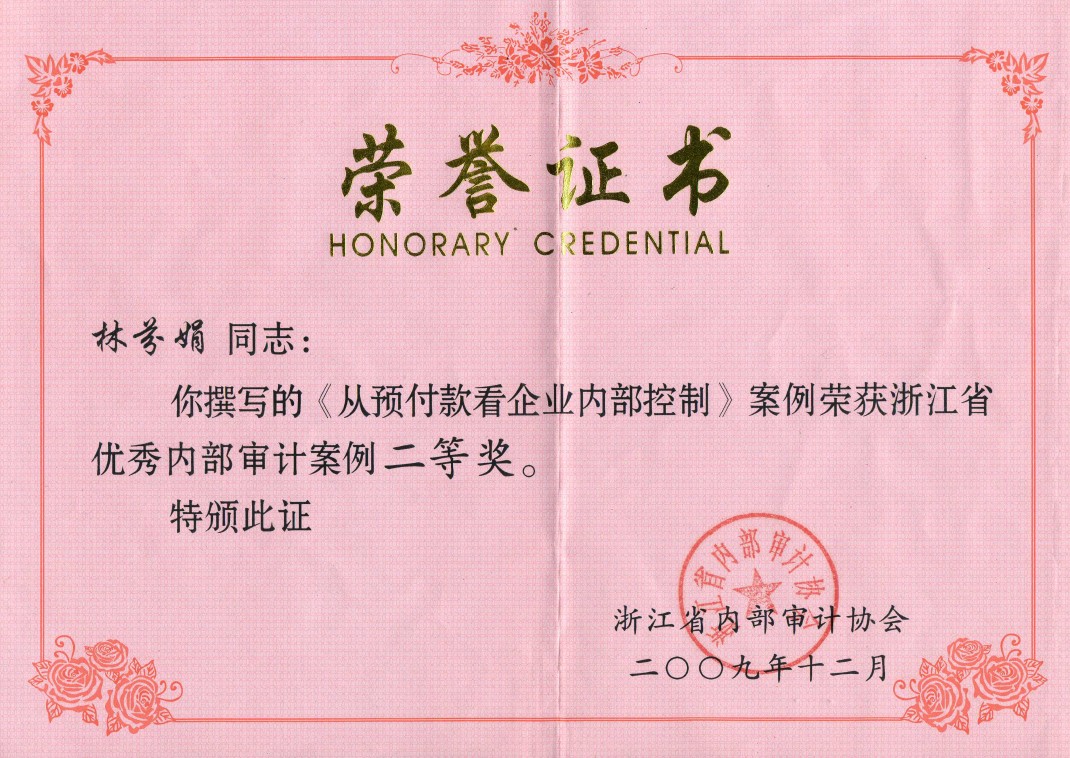 克日,,,,,,,从绍兴市内部审计师协会传来喜讯,,,,,,,审计部选送的《由一件工程舞弊案件引发的思索》荣获浙江省内审案例评选二等奖、市内审案例评选一等奖。。。。。。。同时,,,,,,,转达还表扬了2009年度优异内审项目,,,,,,,审计部的《2009年1-7月药品销售公司退货情形审计》项目获得市内审项目二等奖。。。。。。。之前,,,,,,,审计部司理林芬娟撰写的《从应收款看企业内部控制》一文,,,,,,,也一经获得过浙江省内部审计案例二等奖。。。。。。。